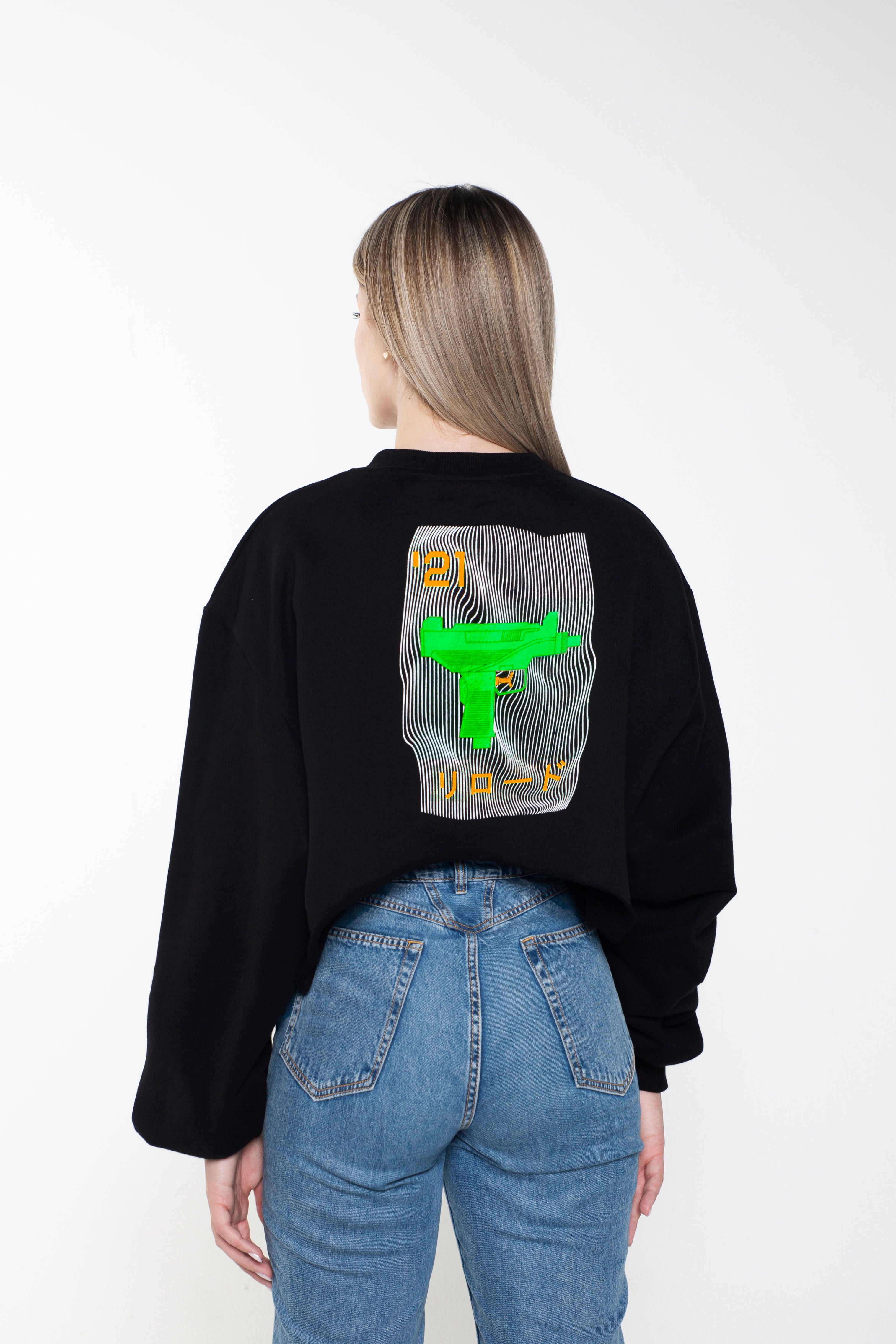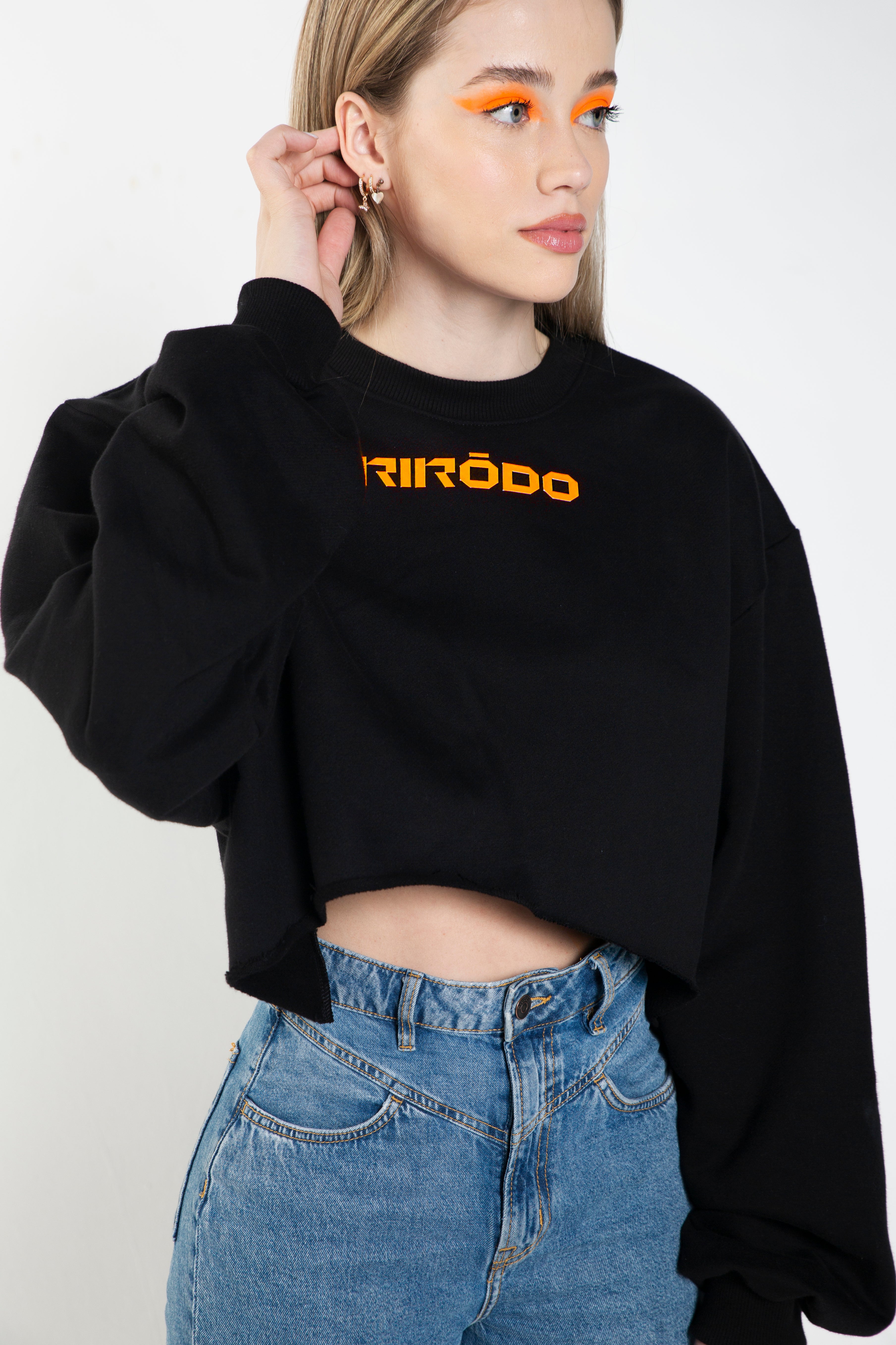 RIRODO GREEN WATER GUN BLACK CROP Cotton Sweatshirt with front orange rubber logo print and back collection print is going is going to take you friends jealous of your style.