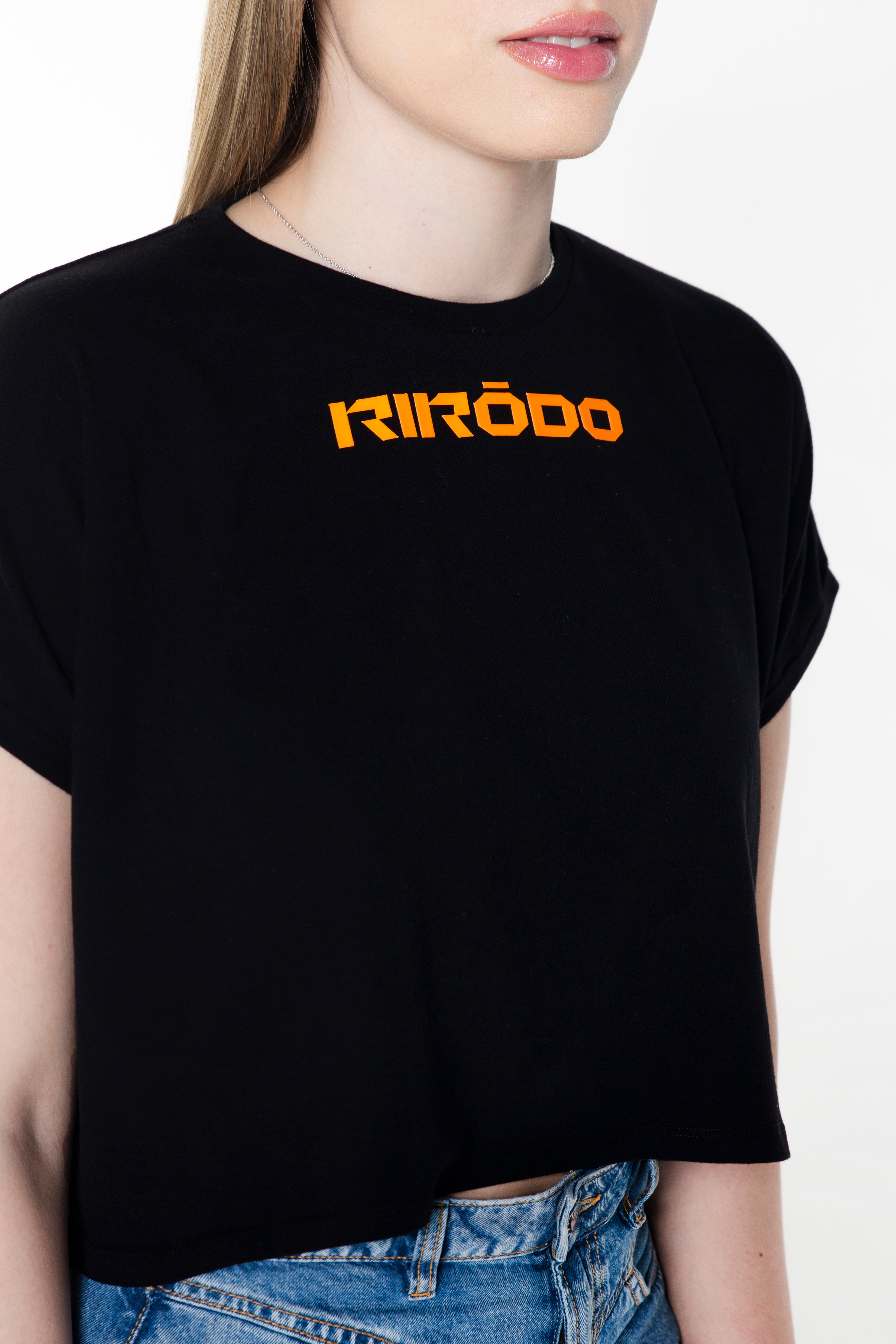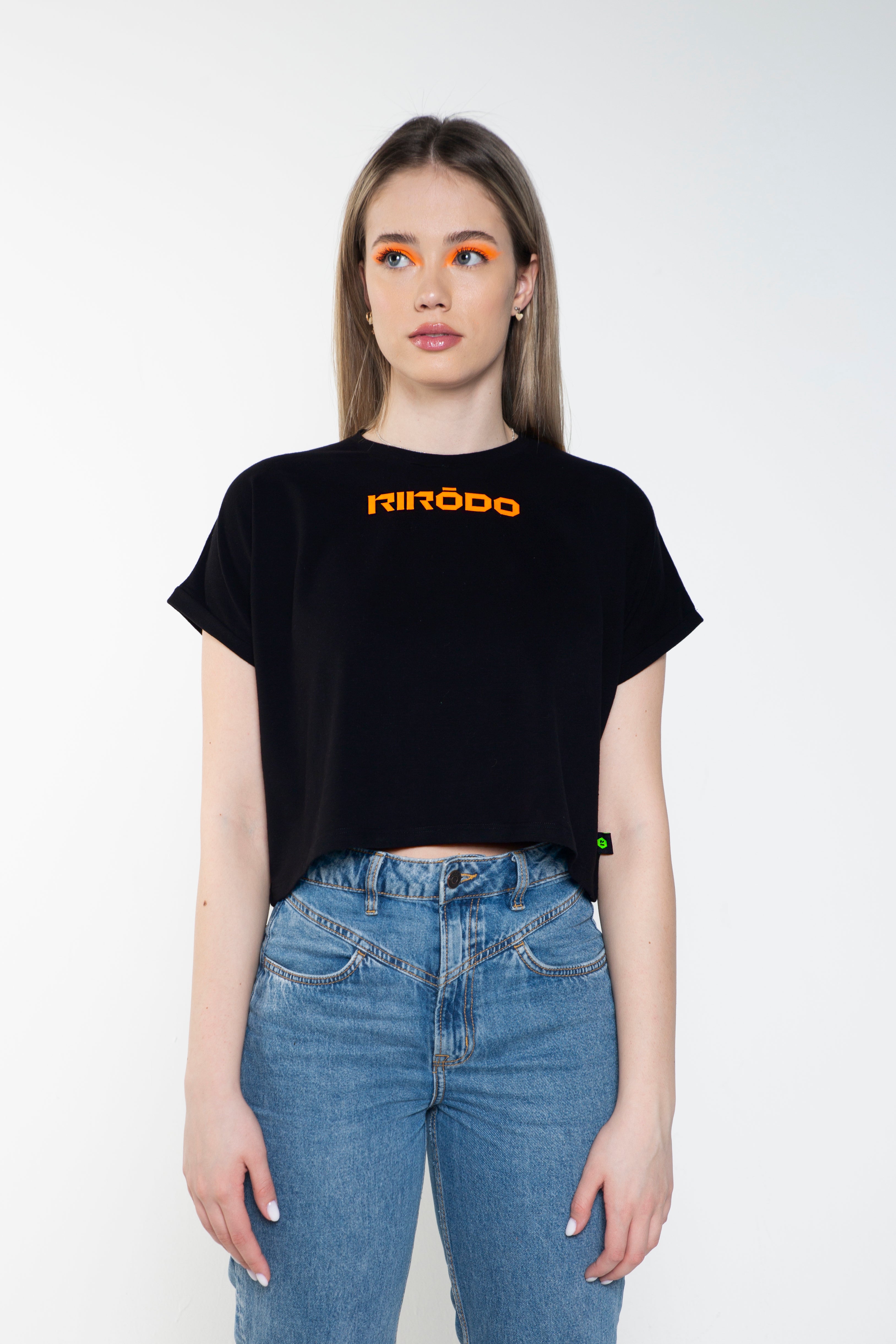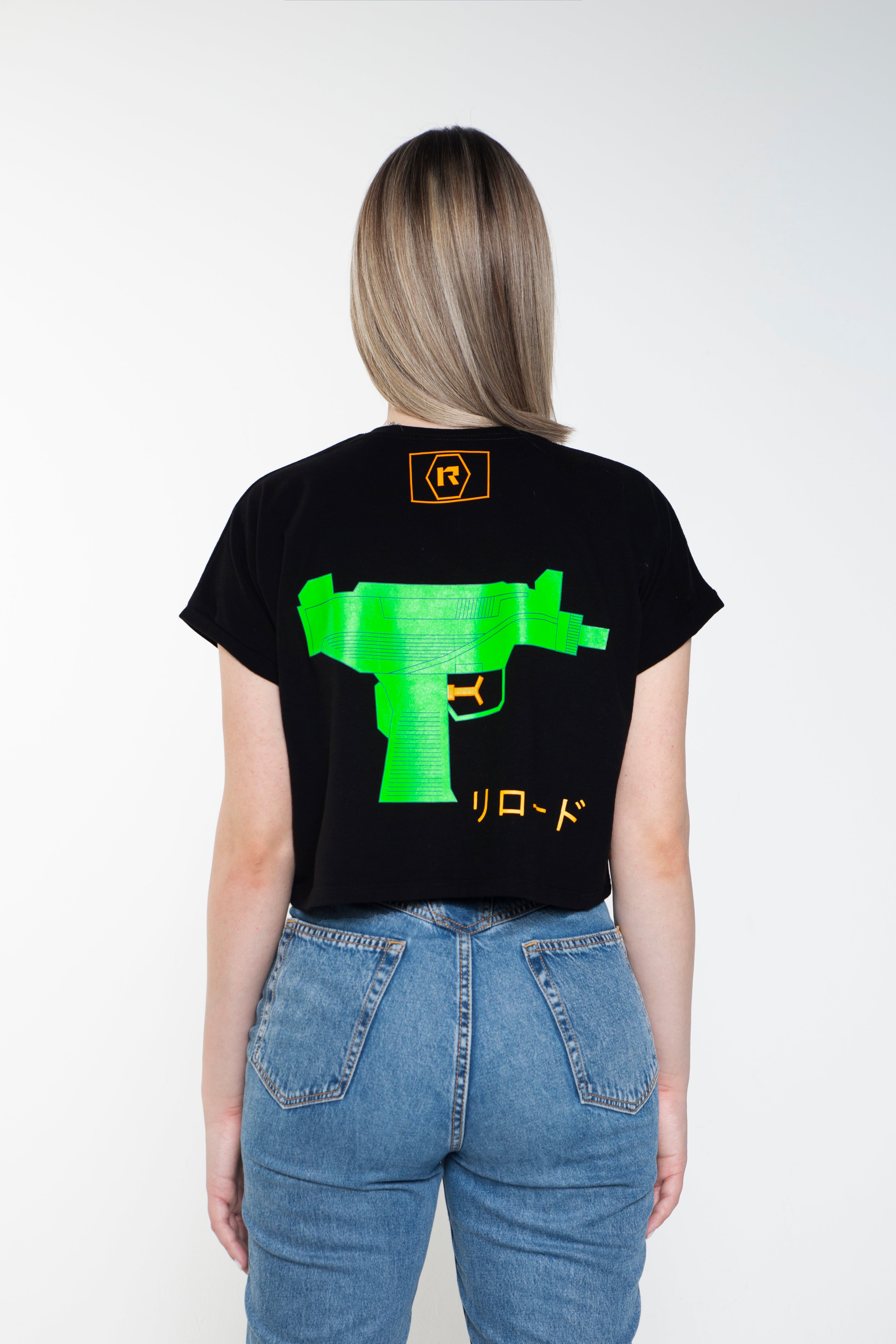 RIRODO GREEN WATER GUN CROP Cotton T-Shirt with front orange rubber logo print and back green water gun Uzi print will shoot them down, bang bang.